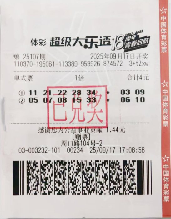 9月17日晚,超级大乐透第25107期开奖,前区开出号码“05、07、08、15、33”,后区开出号码“06、10”。当期全国共中出7注一等奖,其中山东青岛中得2注一等奖。